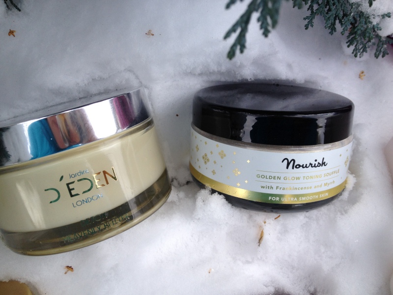 Nourish Golden Glow Toning Souffle. A beautiful, shimmery thick lotion shot with gold light reflecting particles and infused with Frankincense and Myrrh! A lovely way to celebrate Christmas, as a gift or a treat for yourself.